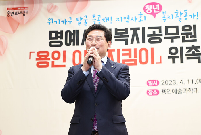 이상일 용인특례시장이 11일 용인예술과학대학 교직원과 재학생 171명을 명예사회복지공무원으로 위촉하고 이들을 대상으로 특강을 진행했다.