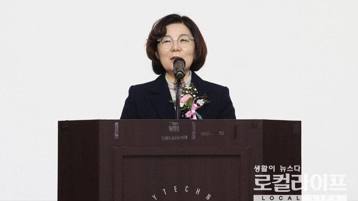 | ▲ 김보라 안성시장이 ‘한국폴리텍대학 반도체융합캠퍼스 2025학년도 입학식’에 참석해 축사를 하고 있다. (사진출처=김보라 페이스북) |