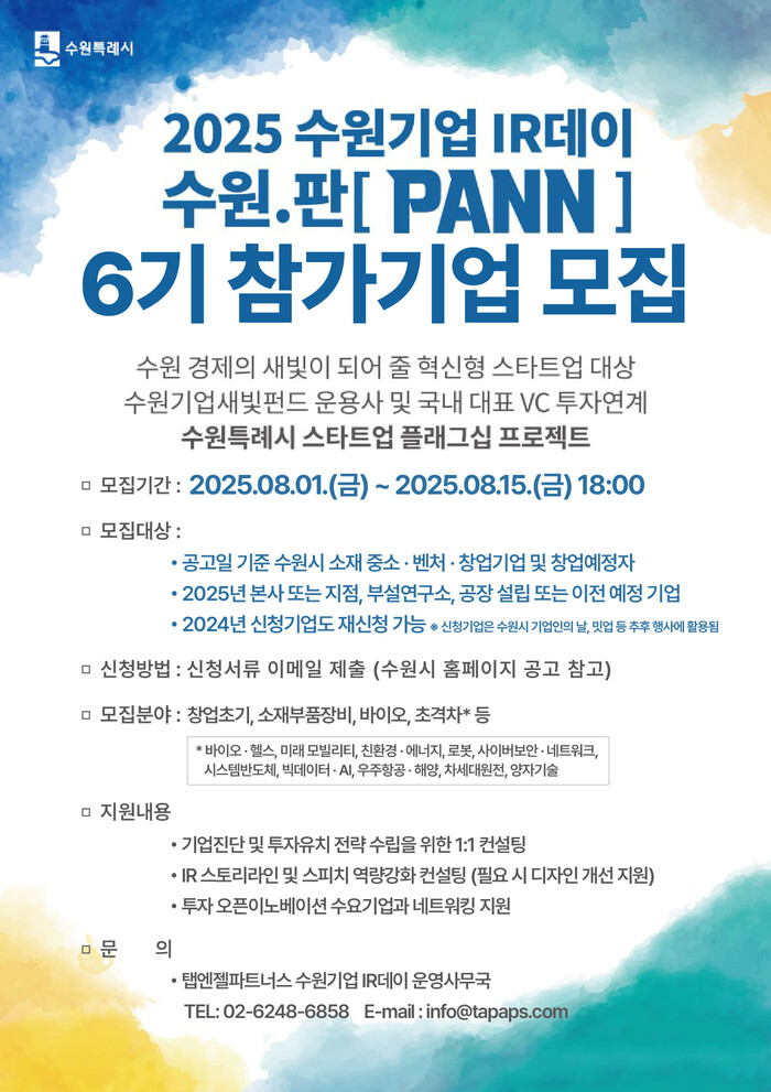 수원시 홈페이지(www.suwon.go.kr) ‘공고/고시/입법예고’ 게시판에서 ‘2025 수원기업 IR데이 수원.판(PANN)’을 검색해 자세한 내용을 확인할 수 있다.