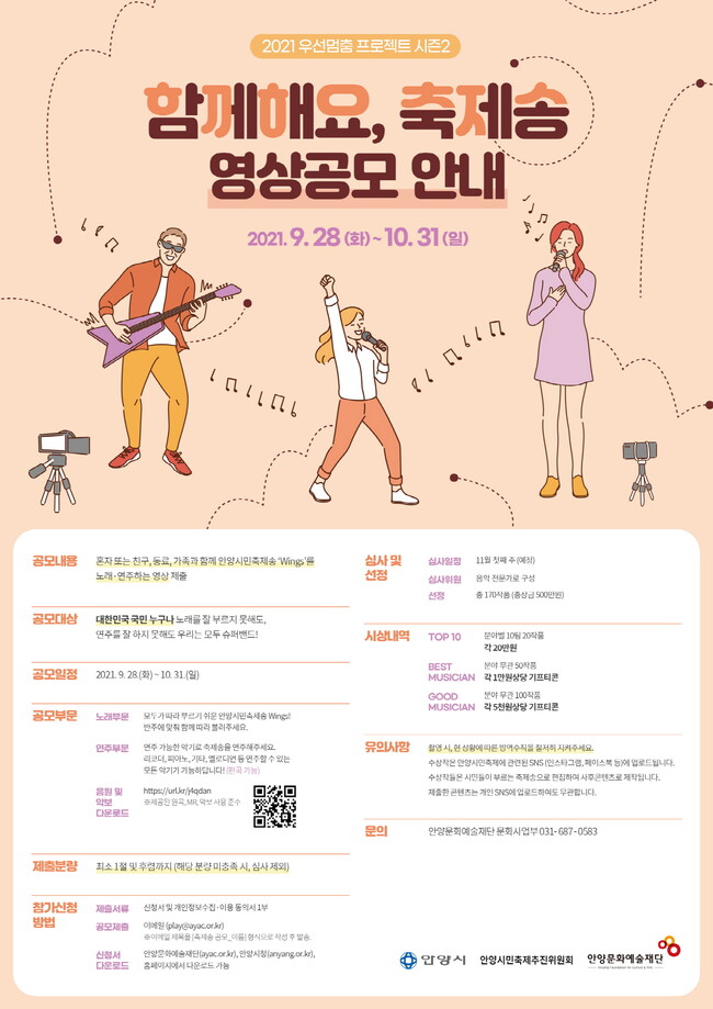 이번 영상 공모전은 안양시민 뿐 아니라 우리나라 국민 누구나 참여 가능하게 참여의 폭을 넓혔다. 또한<함께춰요, 댄스> 영상공모는 모든 세대가 참여 할 수 있도록 K-Pop 커버 댄스, 트로트 댄스, 막춤(스트리트 댄스) 세 분야로 나눠 공모를 진행하고 있다.