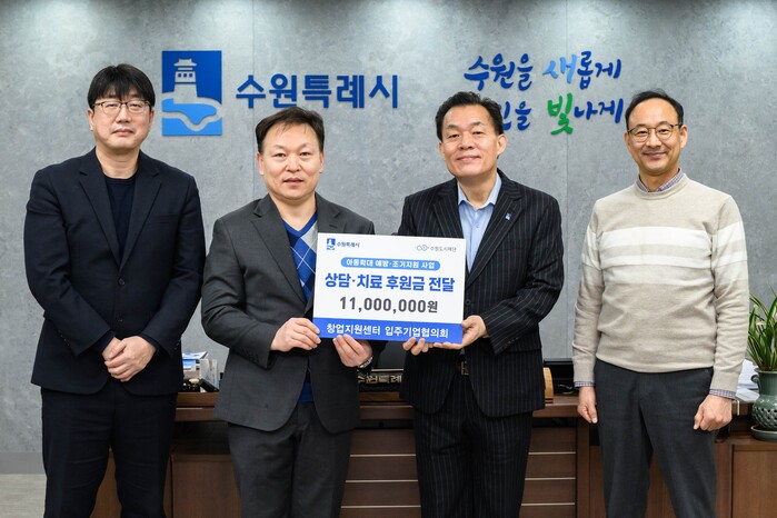수원시 창업지원센터 입주기업협의회가 “학대 피해아동 지원에 사용해 달라”며 수원시에 후원금 1100만 원을 전달했다. 전달식은 30일 이재준 수원시장 집무실에서 열렸다.