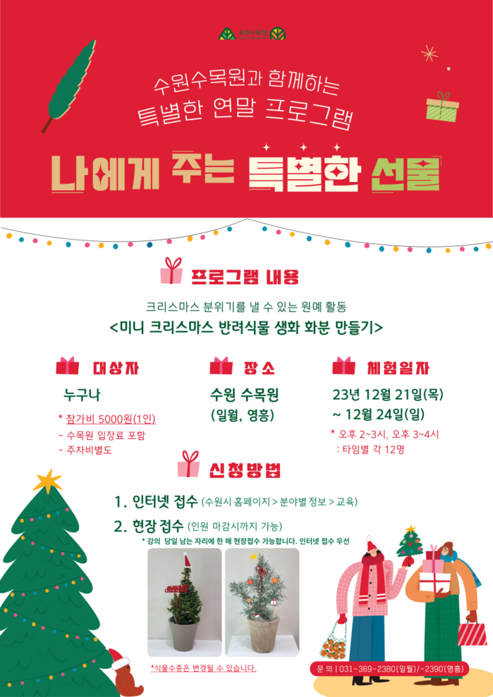 수원시 공원녹지사업소 관계자는 “특별 프로그램에 참여해 즐겁고 따뜻한 크리스마스 분위기를 낼 수 있는 체험을 하길 바란다”고 말했다.