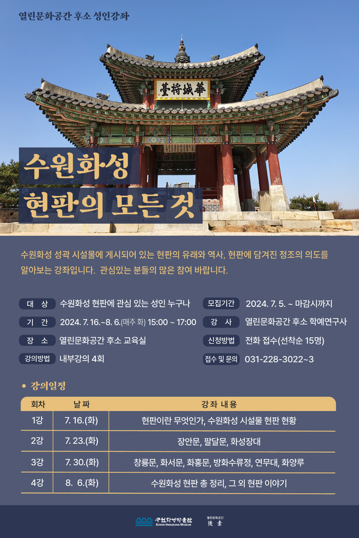 수원화성박물관 열린문화공간 후소에서 7월 16일부터 수원화성 시설물 현판을 주제로 한 성인 강좌 ‘수원화성 현판의 모든 것’이 열린다.