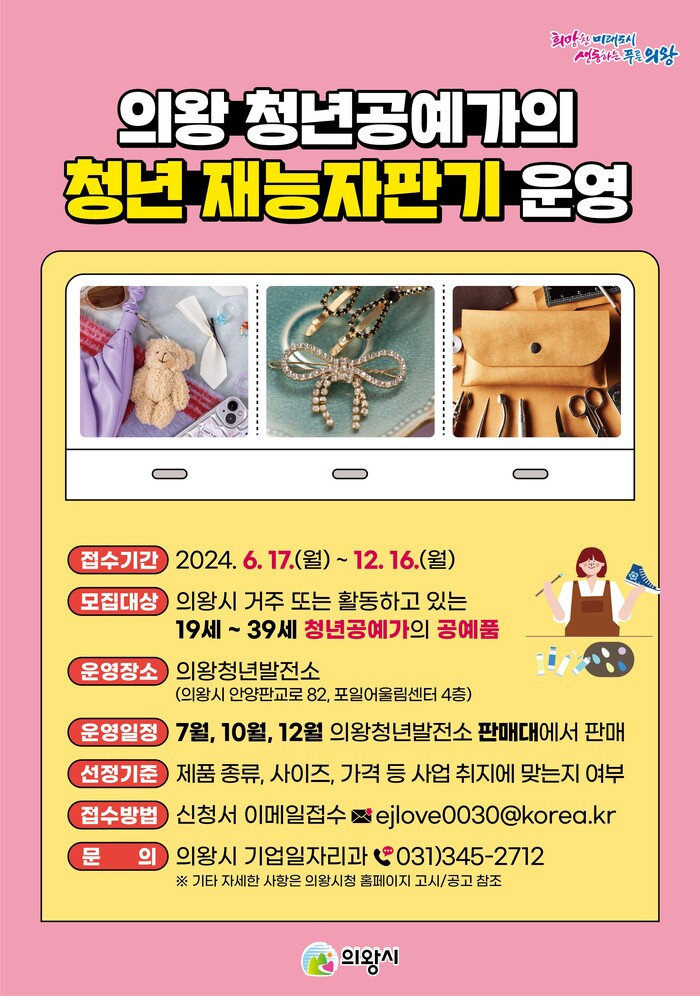 의왕시는 관내 청년 공예가의 공예품 홍보 및 판로지원 등을 통해 청년 공예가의 재능을 장려하고 진로 설정에 도움을 주고자‘청년 재능자판기’ 운영을 시작한다고 밝혔다.