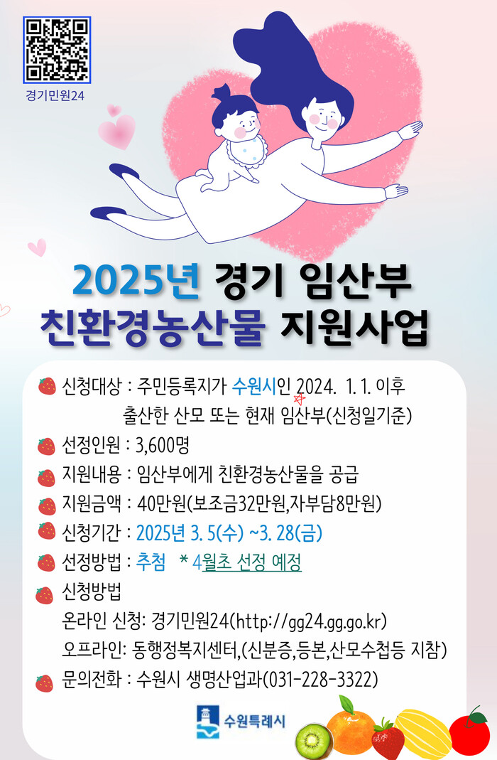 수원시(시장 이재준)가 임산부의 건강을 증진하고, 친환경농산물 소비를 촉진하기 위해 ‘2025년 경기임산부 친환경농산물 지원사업’을 추진한다. 임산부 3600명을 3월 28일까지 모집한다.