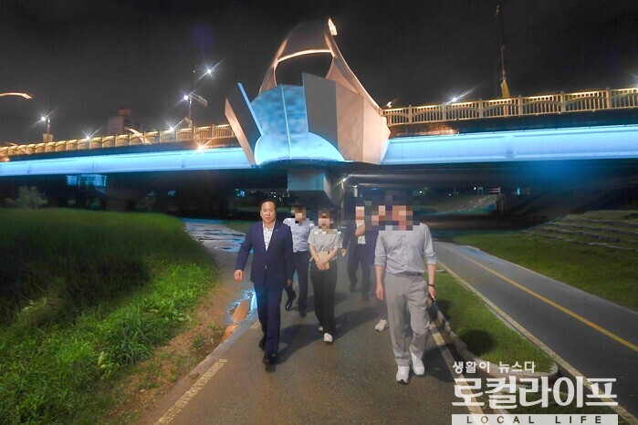 | ▲ 이권재 오산시장이 야간 오산천을 점검하고 있다. (사진출처=이권재 페이스북) |
