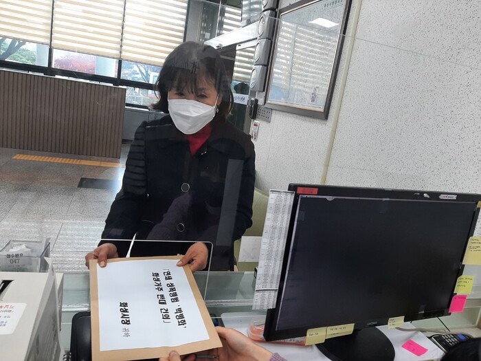 정미애 화성시여성단체협의회장과 101명의 시민들은 한목소리로 건의문을 작성한 뒤 14일 오후, 화성시청 민원실 1번 창구에 접수했다.