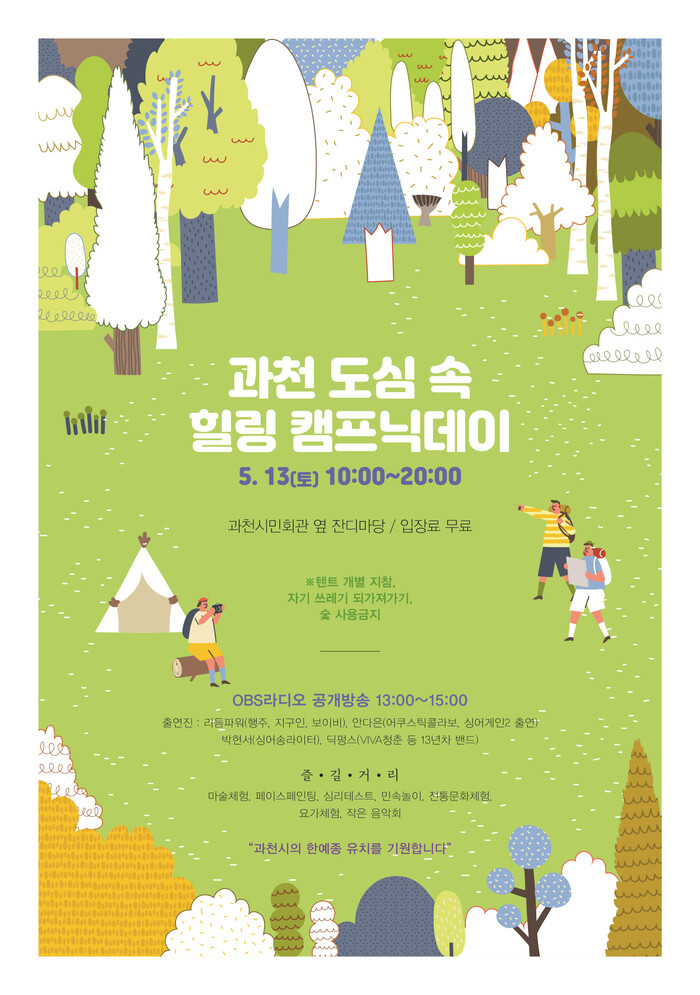 과천시가 오는 13일 과천시민회관 옆 잔디마당에서 시민들이 자유롭게 캠핑과 피크닉을 즐길 수 있도록 하는 ‘도심 속 힐링 캠프닉데이’를 개최한다.