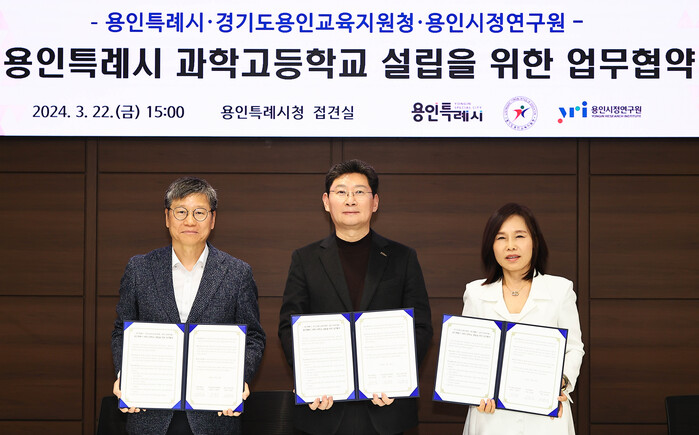 용인특례시(시장 이상일)는 22일 과학 분야의 인재를 양성하기 위해 용인교육지원청‧용인시정연구원과 과학고 설립 업무협약을 체결했다.