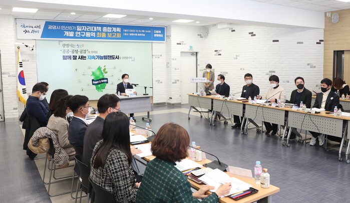 광명시(시장 박승원)는 15일 광명시청 중회의실에서 김규식 광명시 부시장, 이영민 숙명여자대학교 교수, 성영조 경기연구원 경제사회연구실장, 반가운 한국직업능력연구원 동향·데이터분석센터장, 일자리 사업 부서장 등 17명이 참석한 가운데 민선8기 일자리 대책 종합계획 수립 용역 최종 보고회를 가졌다.