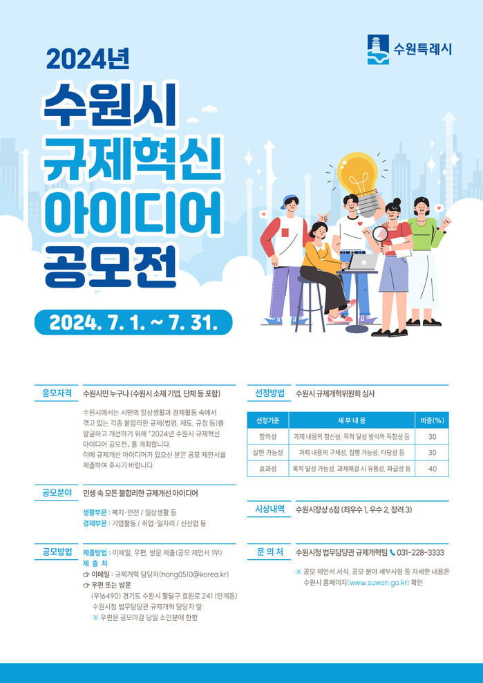 수원시(시장 이재준)가 1일부터 31일까지 ‘2024년 수원시 규제개혁 아이디어 공모전’을 연다.