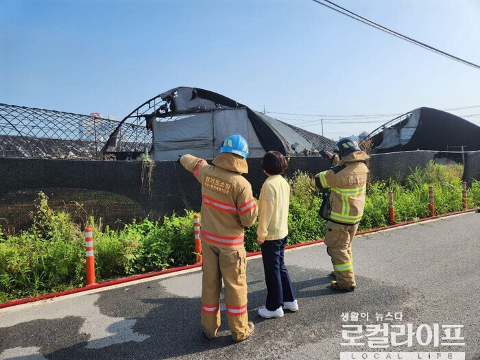 | ▲ 김보라 안성시장(가운데)이 농장 화재 현장을 살펴보고 있다. (사진출처=김보라 페이스북) |