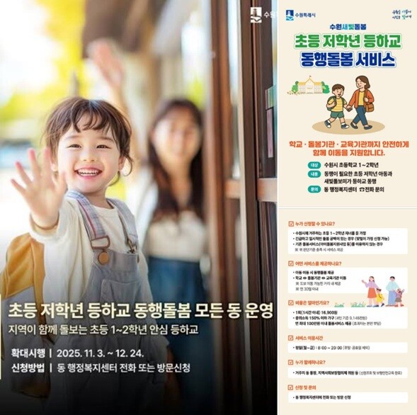 이어 "아이 등하교 시간이 가까워질수록 마음이 조마조마해지는 부모님들, '이 시간쯤이면 잘 가고 있을까?'하고 휴대폰을 들여다보신 적 많으시죠"라며 "시민 제안으로 출발한 '초등 저학년 동행 돌봄 서비스'가 시범 사업을 거쳐 수원시 전역으로 확대된다"고 전했다.