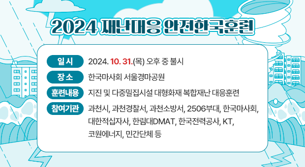 과천시는 오는 10월 31일 소방, 군, 경찰 등 유관기관 및 민간단체와 협력해 ‘2024년 재난대응 안전한국훈련’을 실시한다고 밝혔다.