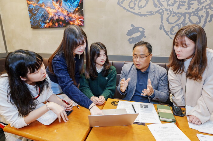 사진/ 지난 11월3일 아주대학교 행정학과 학생들과 수원시 최성혁 팀장이 조모임 수업을 진행하고 있다.(사진제공=수원시)