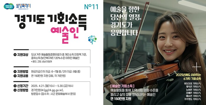 화성특례시(시장 정명근)가 21일부터 5월 30일까지 관내 예술인들의 창작 활동 지원과 관내 문화예술 가치 확산 도모를 위한 ‘예술인 기회소득’ 신청을 받는다.