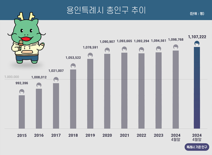 용인시 총인구는 지난 2020년 6월에 109만 1025명으로 109만명 선을 넘어선 뒤 4년 가까이 박스권을 맴돌았으나 최근 처인구 일대 신축 아파트 입주가 이어지면서 올해는 110만명을 무난히 돌파할 것으로 예상된다.