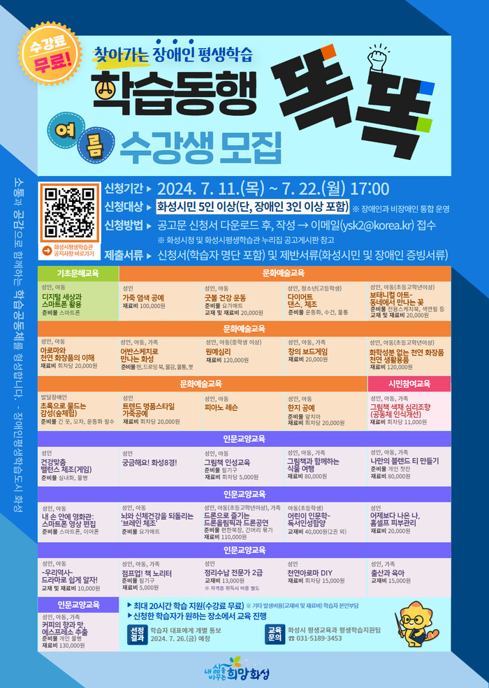 한편, 화성시는 장애인 평생학습동반도시 구축을 위해 지난 5월 화성시 장애인평생학습센터를 개소했으며, 올해부터 장애인 평생교육 이용권 사업을 추진하고 있다.