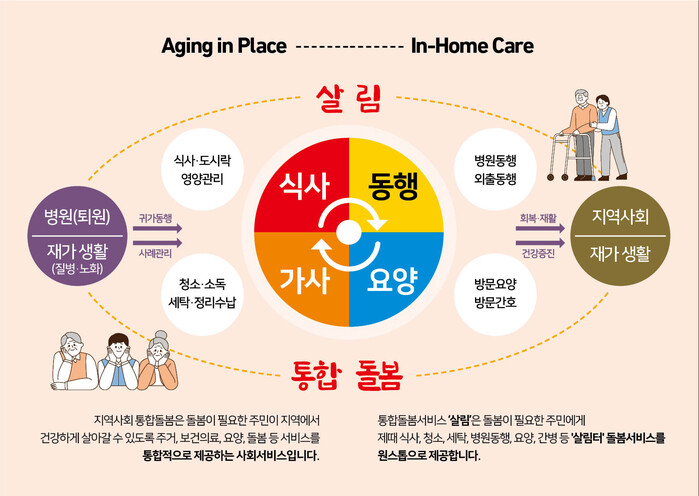 ‘광명형 통합돌봄서비스’ 사업은 돌봄이 필요한 주민이 지역에서 건강하게 살아갈 수 있도록 주거, 보건의료, 요양, 돌봄 등 서비스를 통합적으로 제공하는 지역사회 통합돌봄 정책이다. ‘누구나 살림’을 슬로건으로 지역 곳곳에 돌봄이 필요한 우리 이웃을 위해 ▲병원, 외출 동행서비스 ▲방문요양과 간호 ▲식사, 도시락, 영양관리 ▲청소,소독,세탁.정리수납 등 따뜻한 돌봄서비스를 원스톱으로 제공한다.