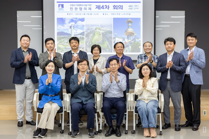 사진/민관협의체 공동위원장인 현근택 수원시 제2부시장(앞줄 왼쪽 2번째)과 장영훈 영통2동 주민자치회장(앞줄 왼쪽 3번째)을 비롯한 위원들이 4차 정례회의에 참석해 기념 촬영을 하고 있다.(사진제공=수원시)