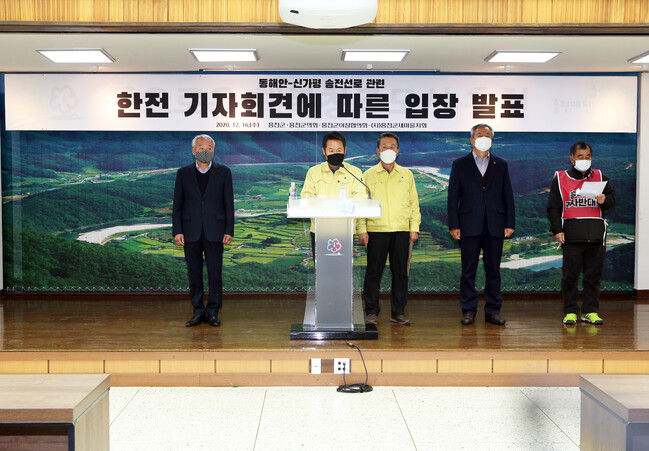 [로컬라이프] 지난 12월 9일 홍천군과 홍천군의회는 동해안-신가평 송전선로 건설사업 추진에 대한 입장을 발표하고, 이에 대한 한전의 진정성 있는 답변과 함께 새로운 계획을 기대했지만, 어제(12월 15일) 발표한 한전의 입장 기자회견은 홍천군⋅홍천군의회 그리고 해당 지역주민의 의견을 반영하지 않은 채 지금까지 불합리한 방법으로 추진한 것이 기에 강력하게 규탄하며, 시기적으로 촉박하다는 사유를 들어 그대로 추진하려는 의도로써 실망을 금할 수가 없다.