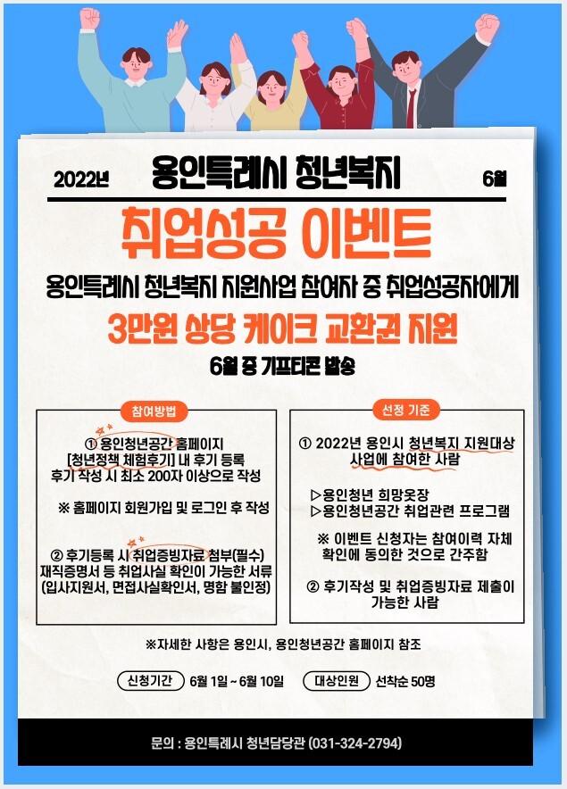 용인시가 시의 청년복지 지원사업을 널리 알리고 청년들의 취업을 응원하기 위해 ‘취업 성공’ 이벤트를 진행한다고 16일 밝혔다.