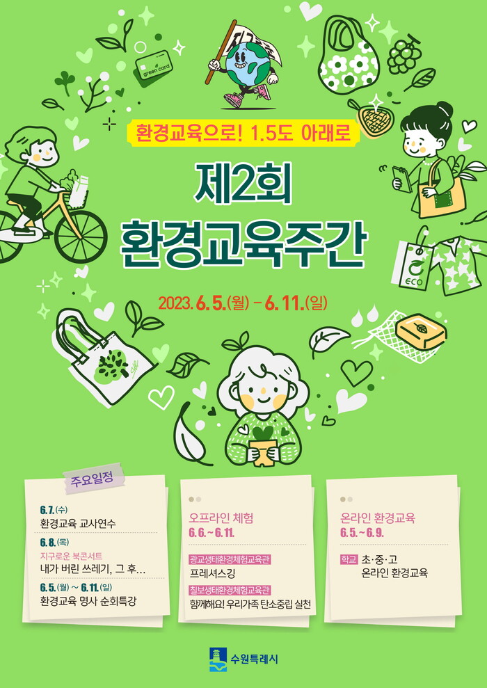 수원시는 5일부터 11일까지 ‘환경교육으로! 1.5도 아래로’를 슬로건으로 하는 ‘제2회 환경교육주간’을 운영한다.