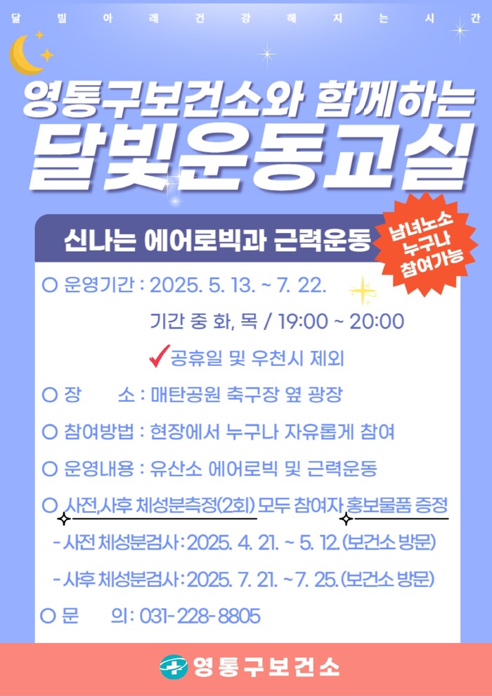 수원 영통구보건소가 야간 운동 프로그램 ‘달빛운동교실’에 참가할 지역 주민 50명을 5월 9일까지 모집한다.