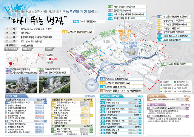 이에 시는 ‘다시 뛰는 병점’을 주제로 한국토지주택공사, 도시재생지원센터, 주민 등과 함께 창업문화복합센터 조성부터 ▲침체된 상권회복 ▲주거환경개선 ▲스마트 기술 도입 ▲공기업과 협업한 공공주택 확충 사업 등을 추진할 계획이다.