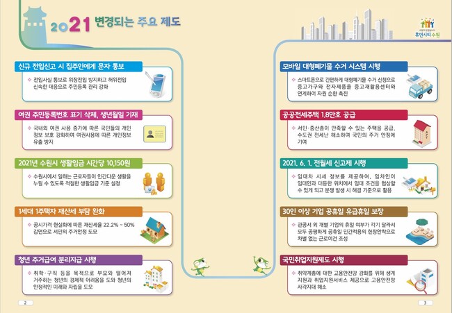 수원시는 「2021 새롭게 달라지는 제도」 700부를 제작해 구청과 동행정복지센터에 배부했다. 수원시 홈페이지(https://www.suwon.go.kr) ‘정보공개/개방→2021년 달라지는 제도’ 게시판에서 파일을 볼 수 있다.