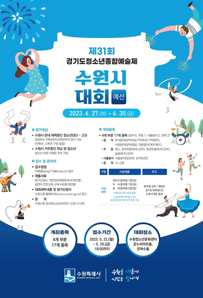 제31회 경기도청소년종합예술제 수원시대회는 6월 27~30일 수원청소년문화센터 온누리아트홀·은하수홀에서 열린다. 종목별로 최우수(1명/팀), 우수(1명/팀), 장려(2명/팀)를 선정해 시상한다.