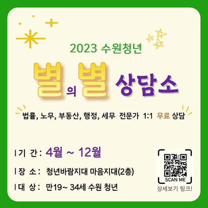 수원시는 수원에서 거주하거나 활동하는 만 19~34세 청년에게 법률‧노무‧부동산‧행정‧세무 5개 분야 전문가 상담을 제공하는 ‘2023 청년 별의별 상담소’를 4월 5일부터 12월 29일까지 운영한다.