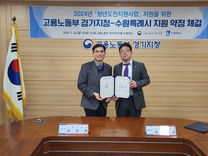 수원시(시장 이재준)가 고용노동부 경기지청과 ‘2024년 청년도전 지원사업’ 지원 약정을 체결하고, 구직단념청년 등을 지원하기로 했다.