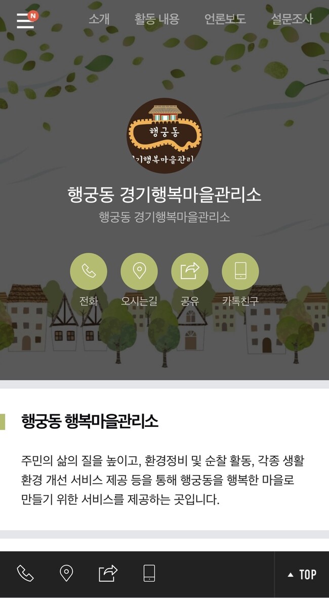 홈페이지(https://hghappytown.modoo.at)에는 정기소식지와 미담 사례·세부 활동내용(사진) 등을 게재할 예정이다. 특색사업, 생활편의서비스 등 행궁동 경기행복마을관리소의 활동을 소개하고, 주민을 대상으로 만족도 조사도 한다.