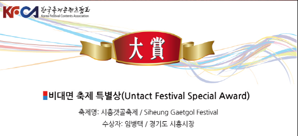 2021 대한민국축제콘텐츠대상 심의위원회는 1차, 2차 심사를 거쳐, 최종적으로 비대면 축제 대상(11개), 명품 축제 특별상(1개), 축제 감독상(1명)을 선정했다. 시흥갯골축제는 이 중 비대면 축제 대상부문에 이름을 올렸다.