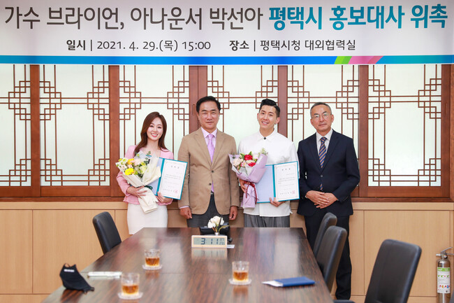 가수 브라이언(주민규)과 아나운서 박선아씨가 평택시 홍보대사로 위촉됐다. 정장선 평택시장은 29일 시청 대외협력실에서 열린 평택시 홍보대사 위촉식을 통해 브라이언과 박선아씨에게 위촉장을 전달했다.