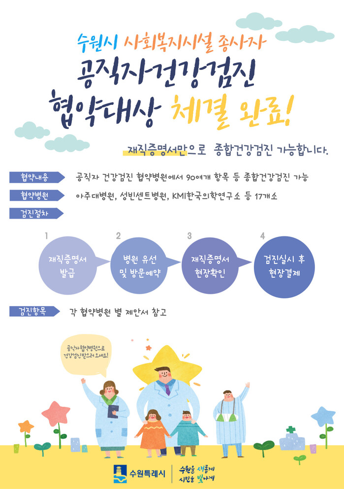 수원시는 ‘공직자 종합건강검진’ 협약 대상에 사회복지시설 종사자를 추가해 올해부터 확대된 항목으로 검진을 받을 수 있게 하였다.