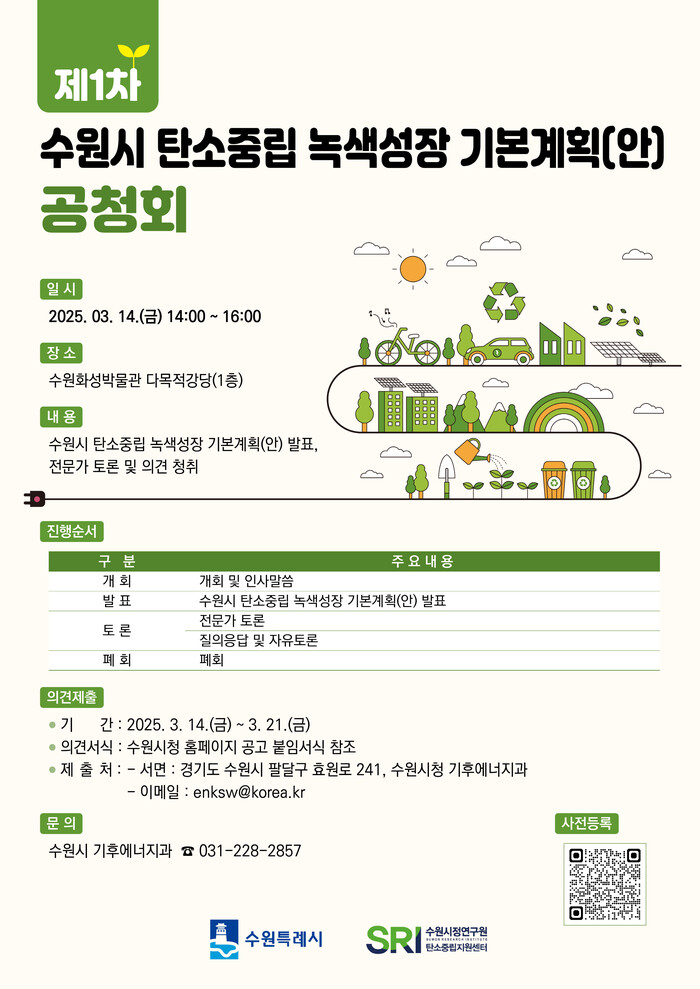 수원시(시장 이재준)가 14일 수원화성박물관에서 제1차 탄소중립 녹색성장 기본계획(안) 공청회를 열고 시민·전문가 의견을 듣는다. 참여를 원하는 시민은 13일까지 홍보물 내 QR코드에 연결된 웹페이지에서 신청하면 된다.