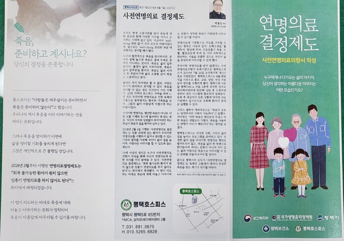 평택보건소 관계자는 “생의 말기의 품위 있는 죽음을 미리 준비하며 환자 본인의 의사가 존중받는 문화가 조성될 수 있도록 최선을 다하겠다”고 말하며, 사전연명의료의향서에 대한 자세한 문의사항은 평택 호스피스 기관(☎031-691-0675, 평택시 평택5로 65) 또는 국민건강보험공단 평택지사(☎1577-1000)로 연락하면 된다고 전했다.