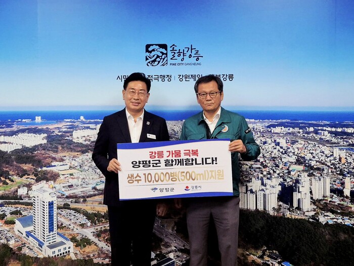 [양평=로컬라이프] 송준형 기자 = 전진선 양평군수는 29일, 가뭄으로 큰 어려움을 겪고 있는 강릉시를 찾아 ‘물맑은양평水’ 생수 1만 병을 전달했다.