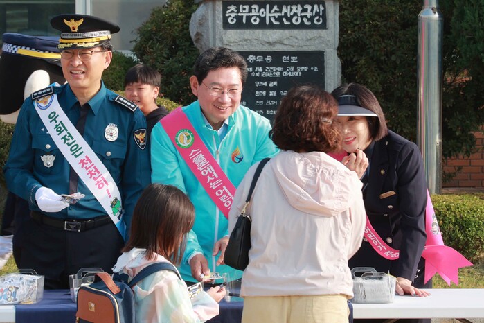 이상일 시장은 학생들에게 교통안전 홍보 물품을 나눠주며 안전 보행을 당부하고, 통학로를 직접 점검하며 교통안전 시설을 살폈다.