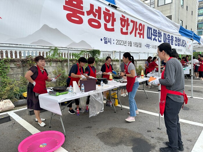 경기도여성단체협의회 수원시지회는 18일 정자2동 주민센터 주차장에서 전, 송편 등 추석 명절음식을 만들어 권선·장안구 사회취약 계층 220가구에 전달했다.