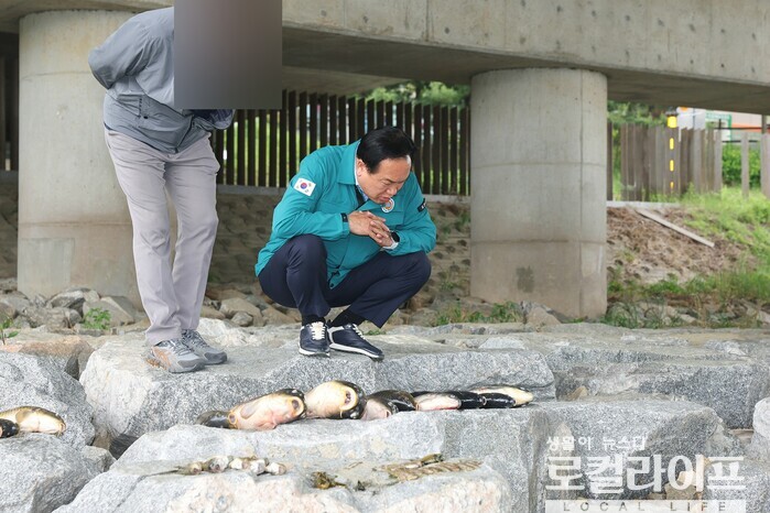 | ▲ 이권재 오산시장이 물고기 폐사 현상이 발생한 오산천을 점검하고 있다. (사진출처=이권재 페이스북) |