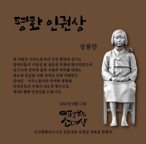 오산 평화의 소녀상(공동대표 강경남·장복실·한명숙)은 이주노동자의 인권 향상과 경기도 장애인들의 이동권 및 생존권 투쟁에 헌신한 다솜교회 성용안 씨를 제4회 오산 평화의 소녀상 평화·인권상 수상자로 선정했다고 밝혔다.