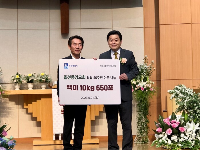 수원 율전중앙교회가 창립 40주년을 맞아 수원시휴먼서비스센터에 쌀 6500kg(10kg 650포)을 기부했다.