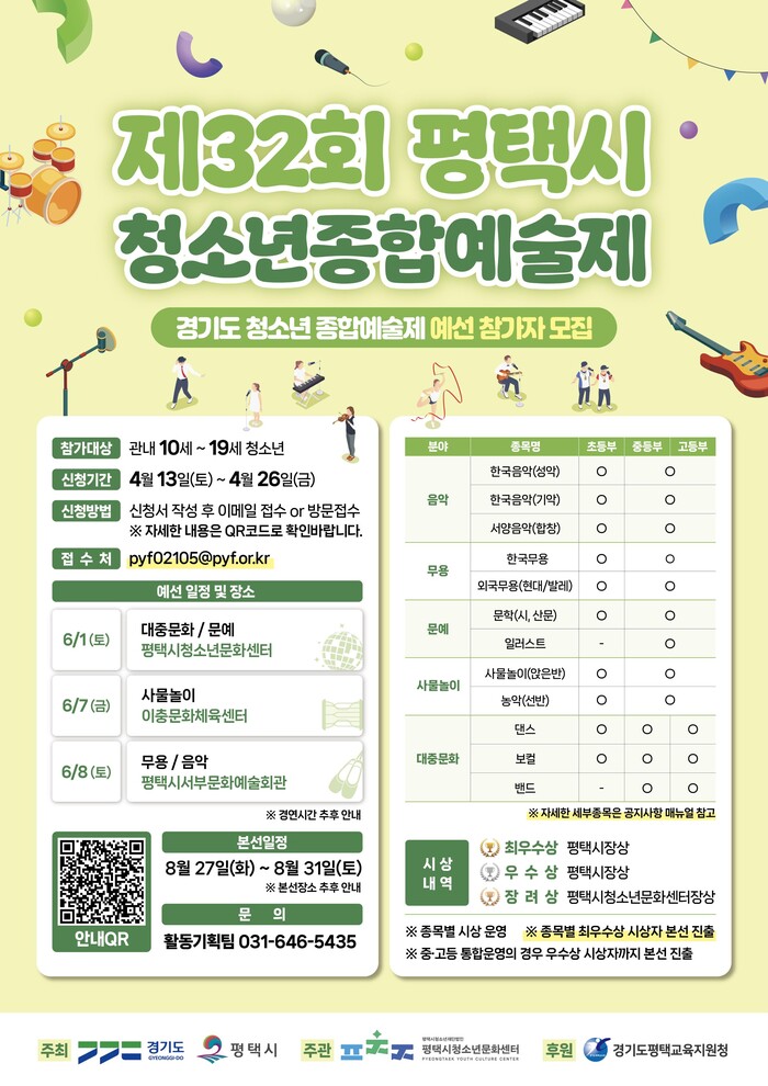 경기도청소년종합예술제 예선은 음악, 사물놀이, 문예, 무용, 대중문화 등 5개 분야 14개의 종목으로 ▲6월 1일 대중문화와 문예를 시작으로 ▲6월 7일 사물놀이 ▲6월 8일 무용과 음악까지 종목별로 진행되며, 참여를 희망하는 관내 10~19세 청소년은 누구나 신청할 수 있다.