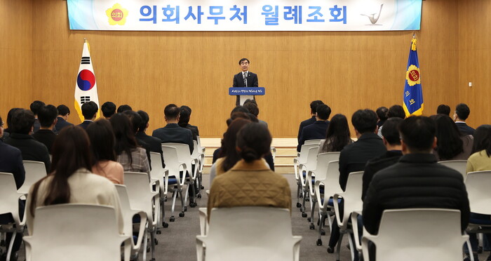염 의장은 6일 오전 의회사무처 대회의실에서 ‘3월 월례조회’를 열고 직원들에게 민생과 도민을 위해 업무에 집중해야 한다고 강조했다.