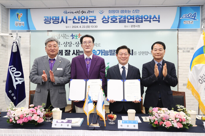 시는 22일 오후 시청 중회의실에서 ‘광명시-신안군 상호결연 협약식’을 개최했다. 이날 협약식에는 박승원 광명시장, 박우량 신안군수, 안성환 광명시의회 의장, 김혁성 신안군의회 의장 등이 참석했다.