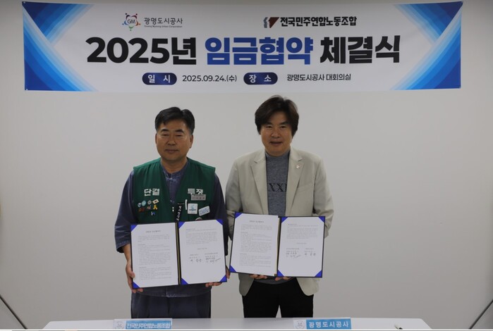 광명도시공사(사장 서일동, 이하 공사)는 공사 교섭대표노조인 전국민주연합노동조합 광명지부와 노사 교섭위원들이 함께 참석한 가운데 2025년 임금협약을 체결했다.