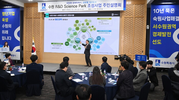 사진/지난해 말 수원 R&D 사이언스파크 조성사업 주민설명회에서 이재준 시장이 첨단과학 연구도시 구상을 설명하고 있다.(사진제공=수원시)